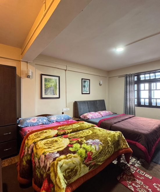 Wake up to beautiful views of Darjeeling’s hills and mountains, framed by large windows that bring in plenty of natural light. The room is bright, airy, and cozy—ideal for friends, siblings, or colleagues traveling together.